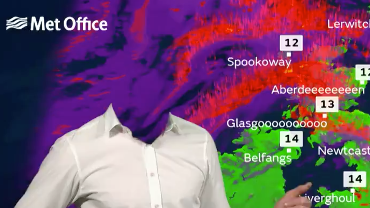 Some newscasts get into the Halloween spirit with jack o'lanterns and costumes, but the UK's Met Office weather man went all out for his October 31st forecast.